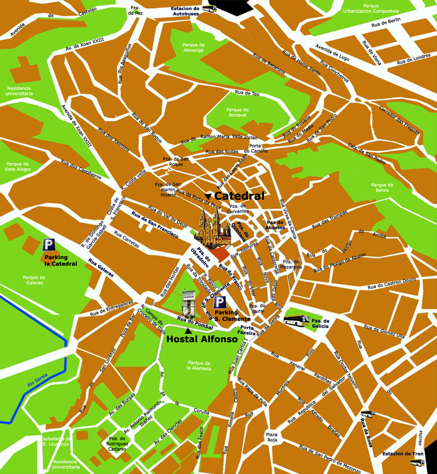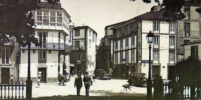 Además es una de las calles que nacen del eje central de la ciudad, "A Porta Faxeira", lugar donde inicia el Parque de la Alameda y la zona comercial, la Rúa do Franco famosa por sus Restaurantes y la Rúa da Senra que termina en la Plaza de Galicia, donde se ubica la parada más cercana al Hostal del autobus del aeropuerto.